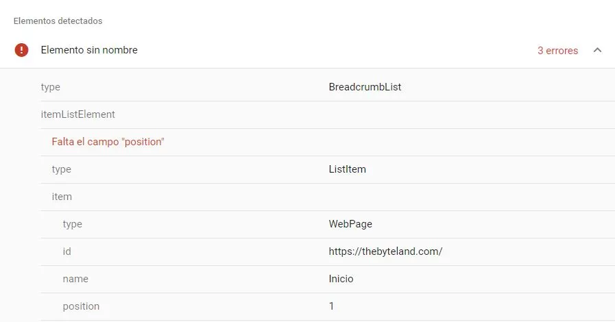 - Indicamos la propiedad position (obligatoria) que indicará la posición del elemento respecto al total de enlaces del breadcrumb, empezando por 1 (Aquí no se empieza por 0).